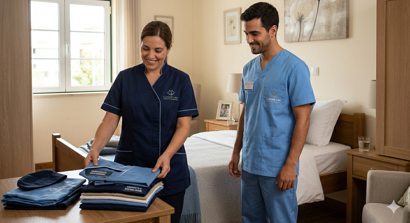 "Uniformes que cuidam de quem cuida. Proteção para o profissional, confiança para a família e dignidade para o residente."